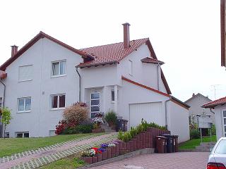Doppelhaus mit Erker und Garage und Säulen im Eingangsbereich; Keller-, Erd- und Dachgeschoss.